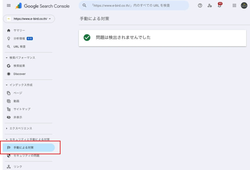 Search Console(サーチコンソール)の左側のメニュー「セキュリティと手動による対策」から確認できます。