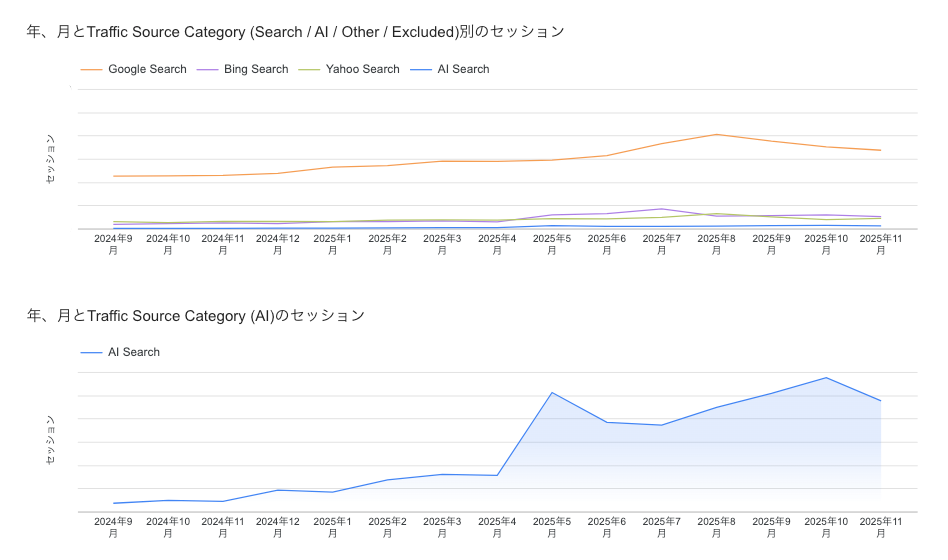 グラフを見ると、2024年まではAI検索経由の流入はほとんどなく、数字としてはごく小さな動きに留まっています。しかし2025年に入ると傾向が変わり、明確な立ち上がりが確認できます。月ごとの波はあるものの、流れとしては右肩方向です。全体のアクセス数に対する割合で言えばまだ数%ですが、前年まで存在しなかった導線が数字として可視化されてきたことは、今後の流入構造に変化が起きつつある兆しとみてよいでしょう。