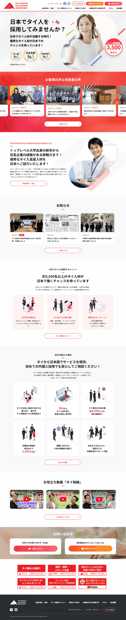 THAI NIPPON FELLOWSHIP RECRUITMENT は、タイ現地から優秀なタイ人高度人材を日本企業へ紹介する人材紹介サービスの公式WEBサイトです。タイ労働局認可のライセンスを取得し、優れた登録者ネットワークと30年以上の実績を持つパーソネルコンサルタントのグループ企業として、求職者・企業双方に安心感のあるサポートを提供しています。